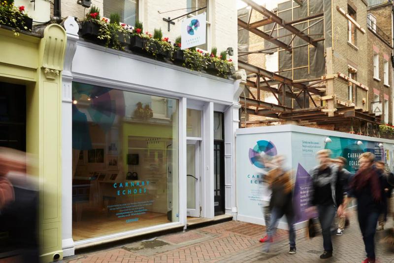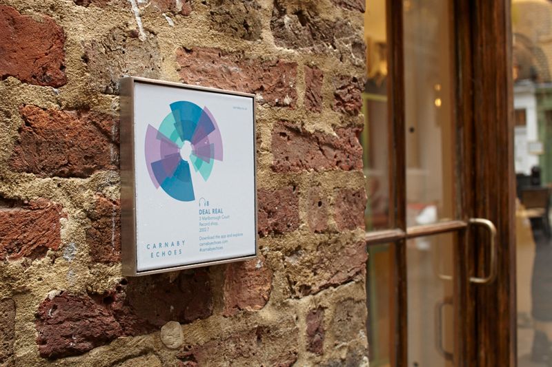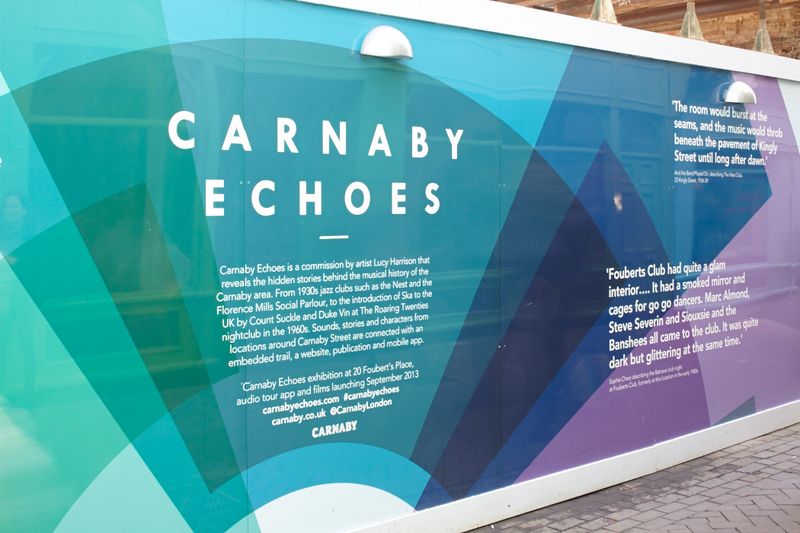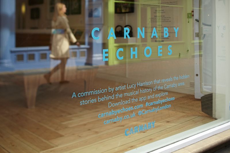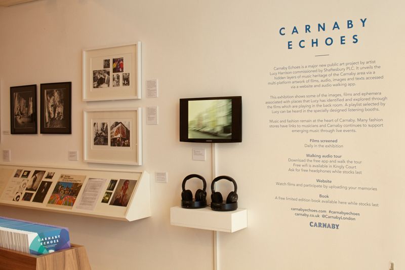 Carnaby Echoes is a major public art project by artist Lucy Harrison, commissioned by Shaftesbury PLC and curated by Futurecity. Launched in 2013, the project reveals the rich and often overlooked music heritage of the Carnaby Street area through a multi-platform artwork combining film, audio, photography and text.