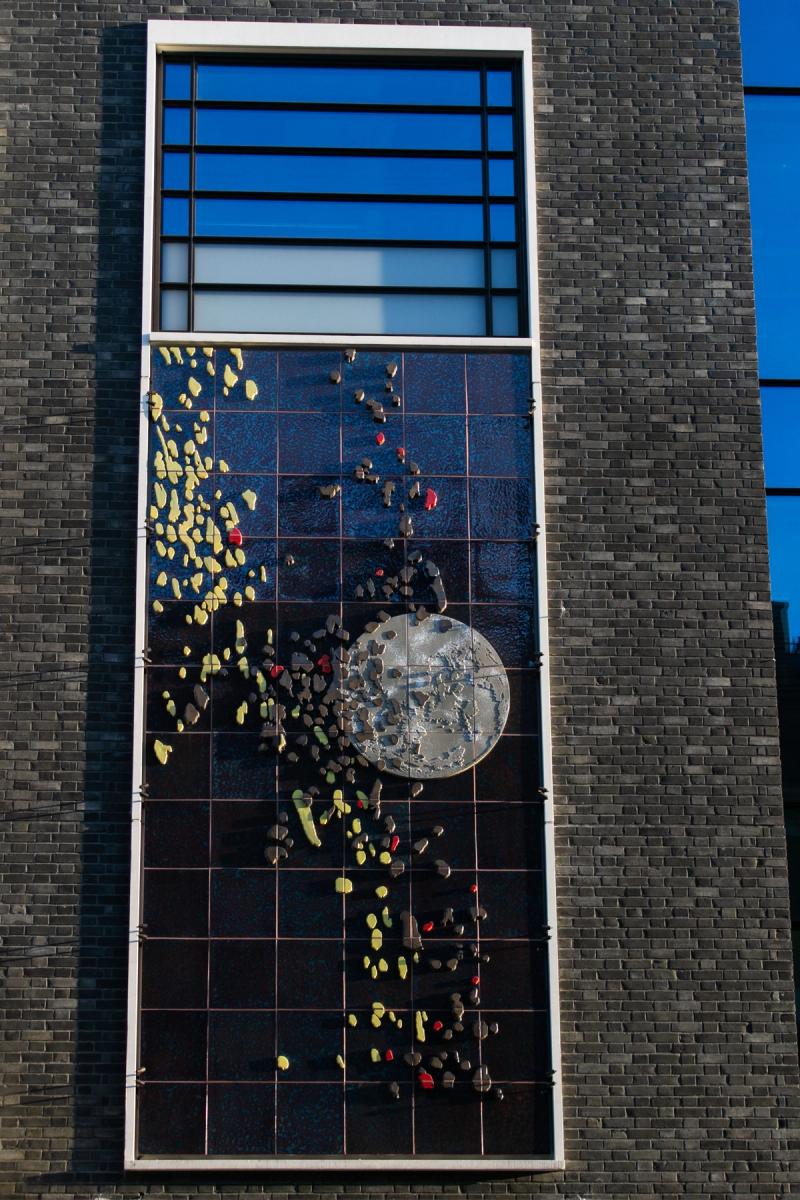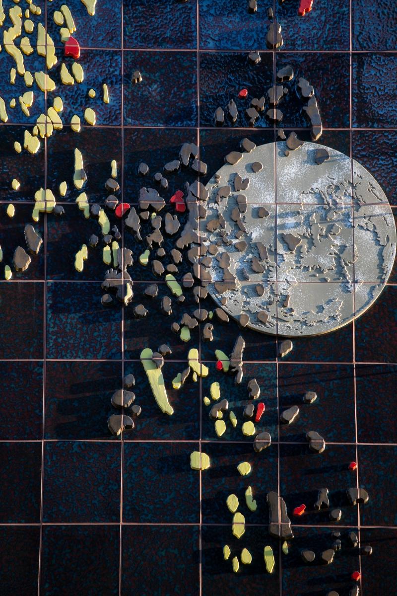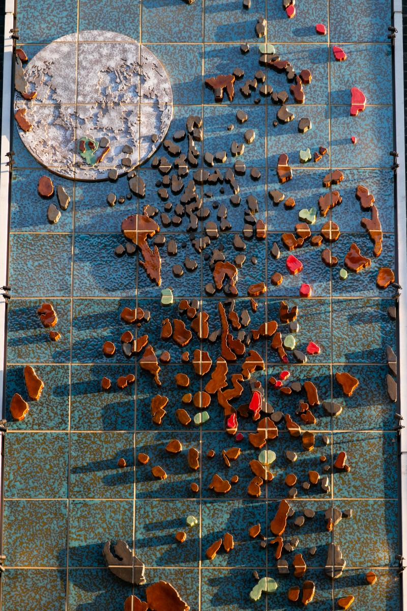 During daylight, the ceramic reliefs cast animated shadows across the building’s façade, echoing a sundial’s slow dance. By night, the artwork is dramatically lit, engaging with its surroundings like a moving image frozen in clay.