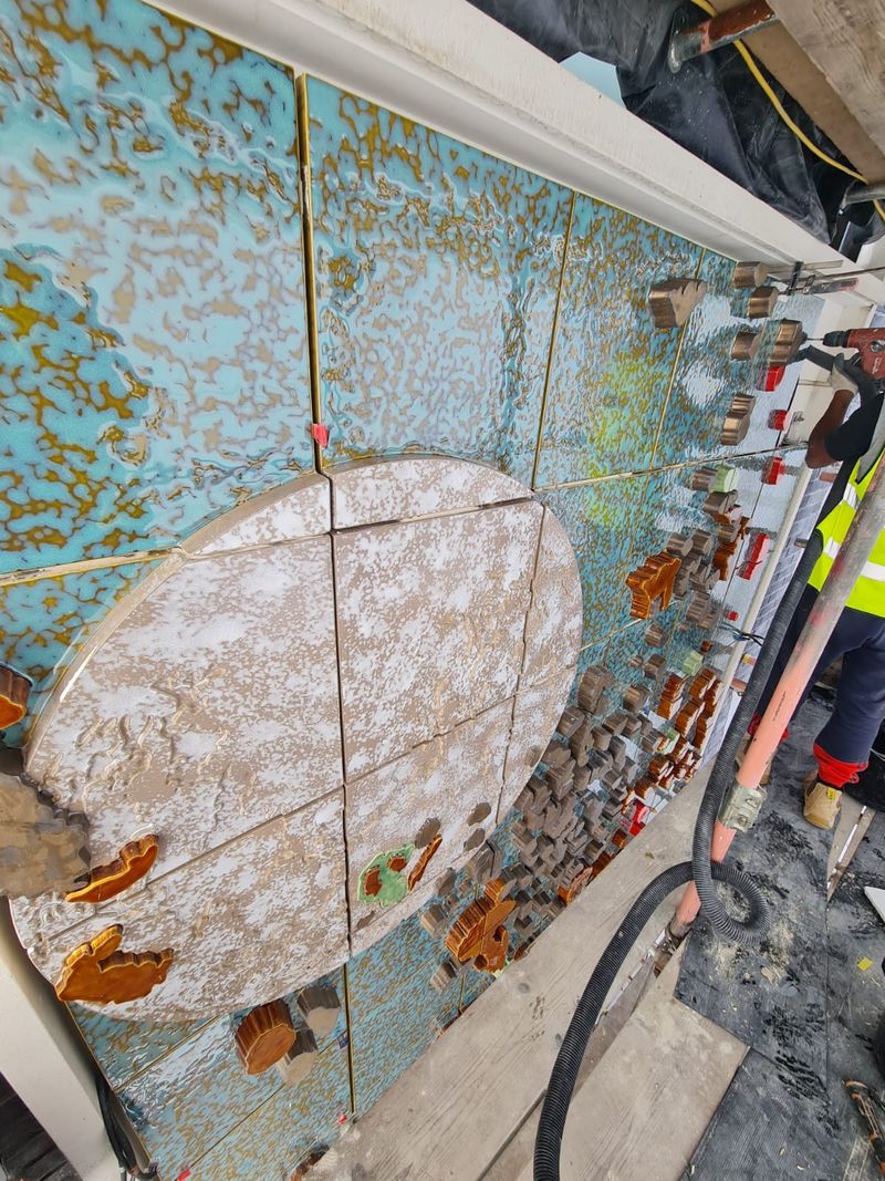 Measuring 609 × 288 cm each, the two vertical panels occupy the original façade panels of the Gaumont Palace Theatre, opened in 1934, which once listed film titles and screen stars. Crafted from 144 hand-glazed tiles, each with sculpted relief patterns, the work draws on a wealth of cultural reference points - from gothic literature and early cinema to fashion and local craftsmanship.