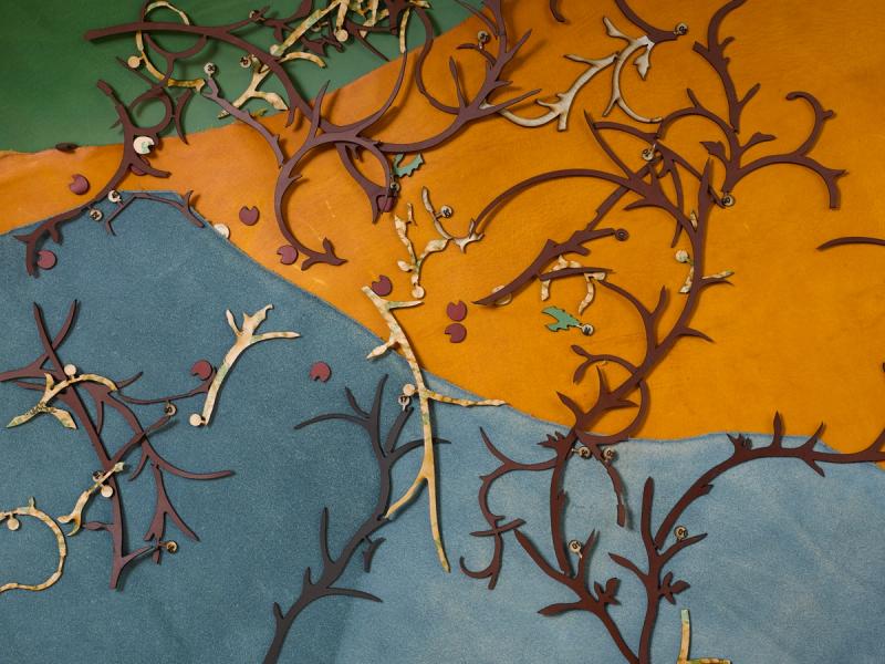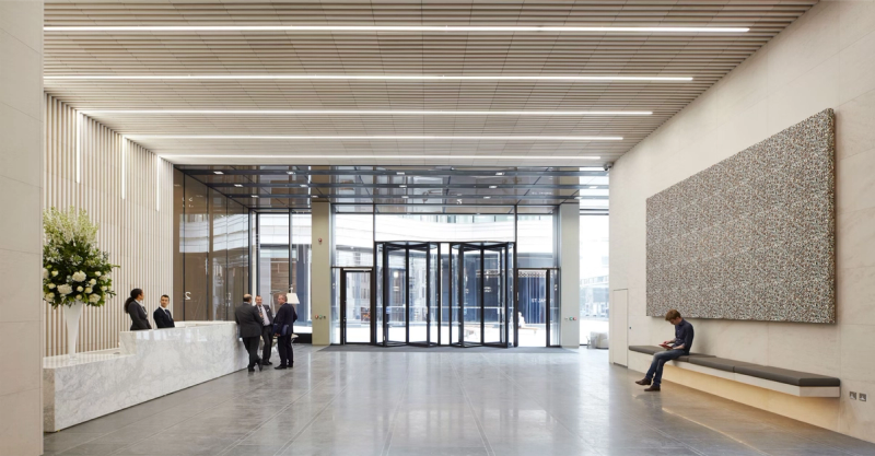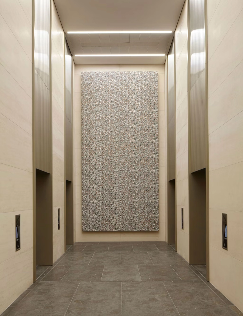 The two interior pieces made with over 17,000 individual pieces of laser-cut leather are made of an intricate lattice laid over a Corian panel. Inspired by early 17th century fabrics, the bespoke pattern developed by Thorpe references the exquisite detail found in clothing that might have been seen on the traders when St James’s Market first sprang to life in the 1600s.