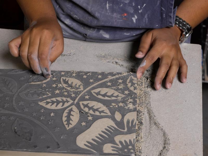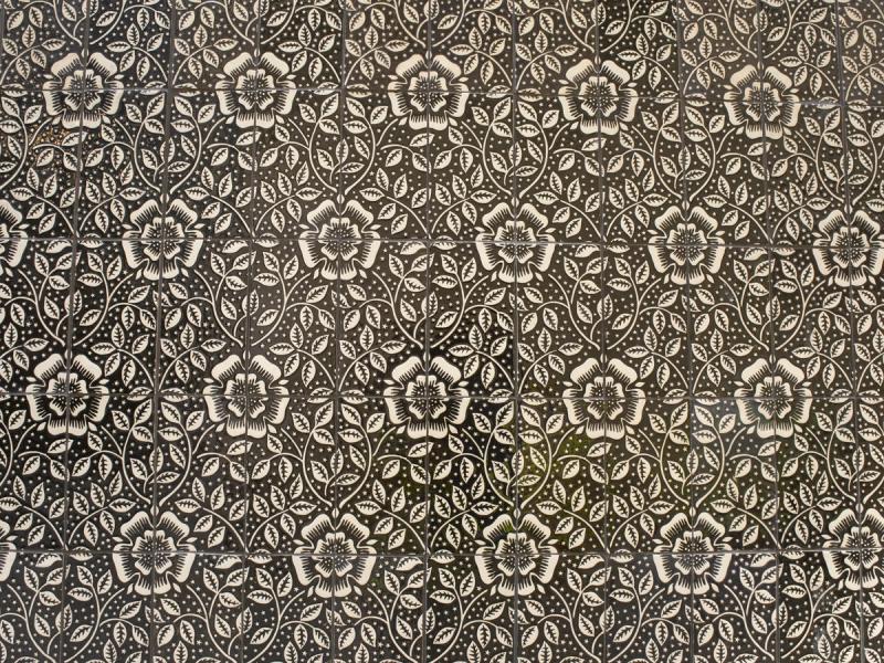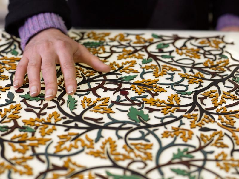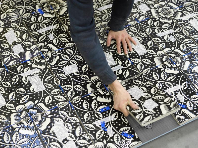 The three large-scale exterior panels made from over 1,000 handmade encaustic tiles repeat a pattern inspired by the work of the 19th century Arts and Crafts bookbinder TJ Cobden Sanderson.
