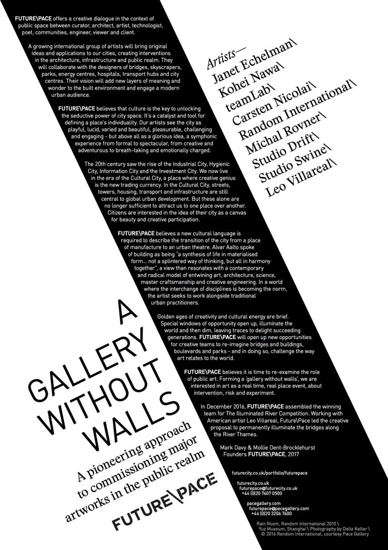 FuturePace was a two-year initiative by Futurecity and Pace Gallery. The programme took the collaborative energies of an international group of artists and offered a pioneering approach to commissioning public art that created an impactful, engaging and exhilarating ’gallery without walls’.
