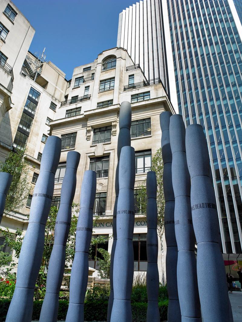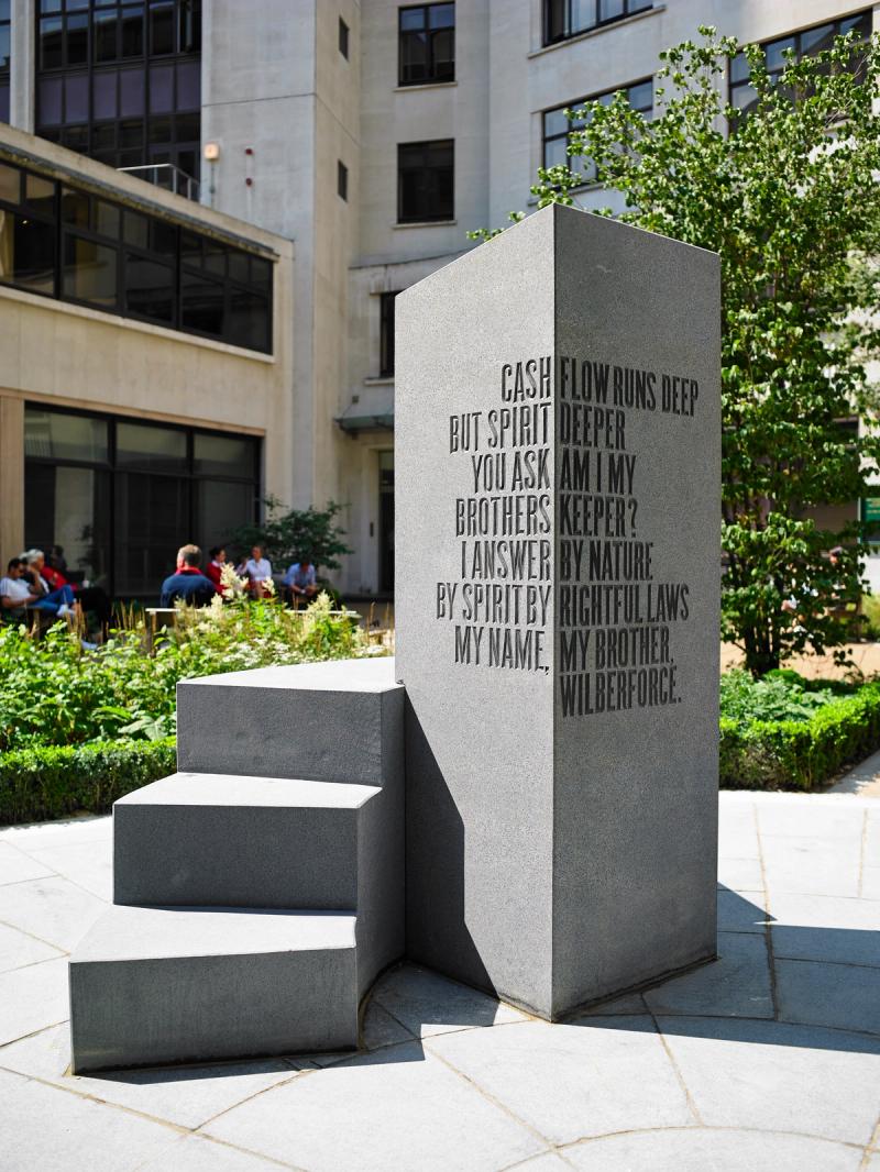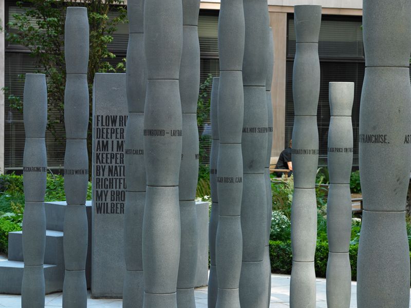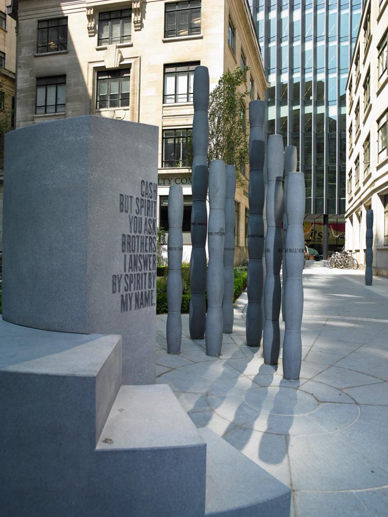 Poet Lemn Sissay responded with an original poem that weaves biblical reference, the language of the stock exchange and the moral contradictions of Britain’s role in the slave trade. Lines are engraved into each column, with the full poem presented on a nearby plaque.