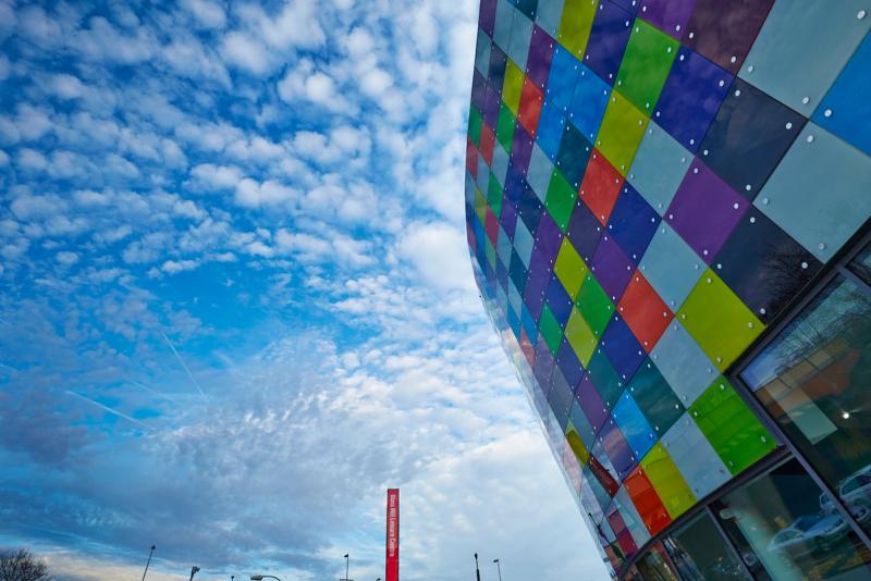 Artist Phil Coy was commissioned to create a site-specific artwork responding to the building’s curved glass façade. His installation comprises approximately 1,800 coloured glass ‘pixels’ arranged in a multicoloured grid that wraps around the exterior of the building.