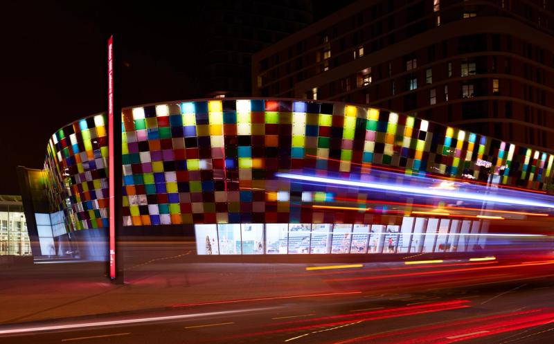 Backlit and sensor-driven, the façade responds to external sound - from traffic noise to the human voice - using bespoke programming to modulate colour and intensity in real time. The result is a dynamic night-time presence that transforms the building into an interactive civic landmark.