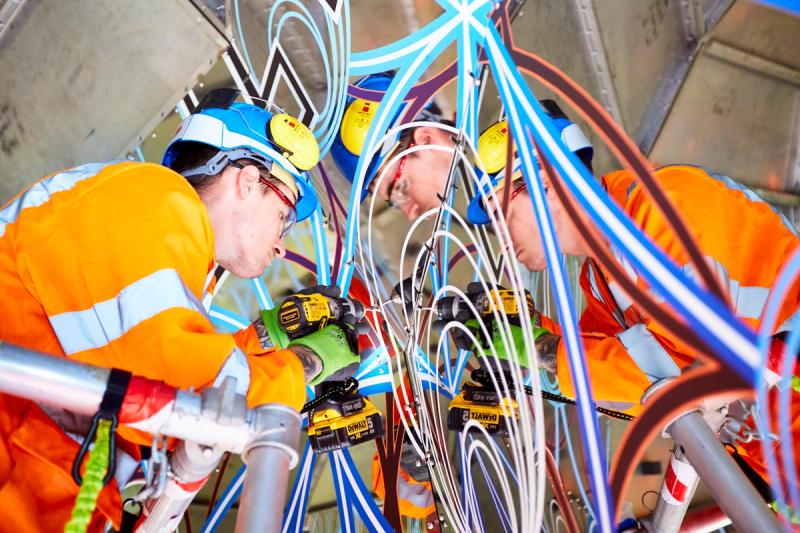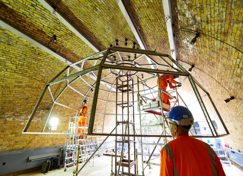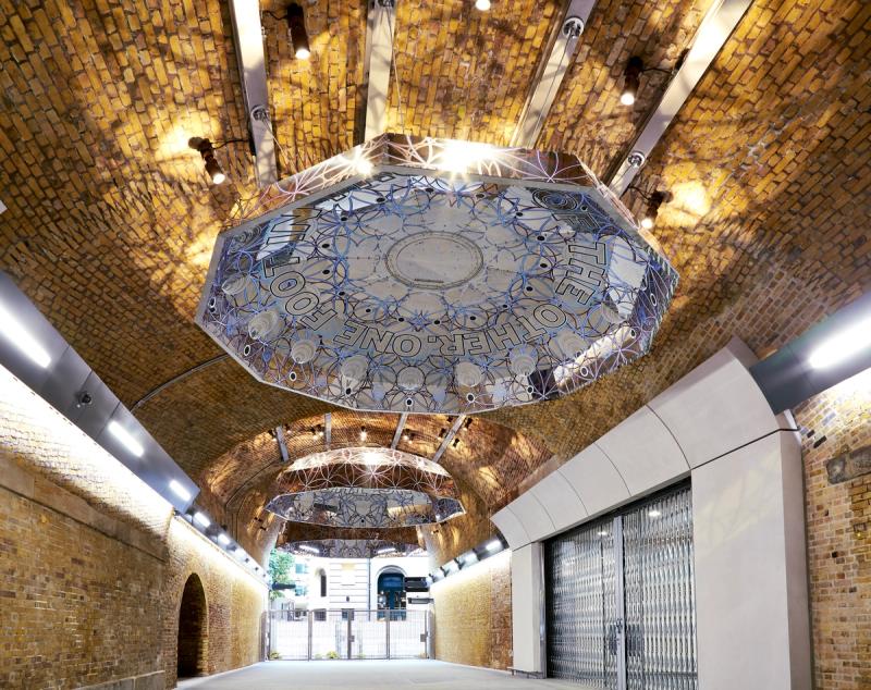 ‘Me. Here. Now.’ comprises three giant polished stainless steel domes suspended from the ceiling of the new walkway at London Bridge station in the Stainer Street Tunnel. Mirrored inside and out, the domes reflect both the existing brickwork of the walkway ceiling and the movement and colour of everyday life below. These reflections animate the domes, continually shifting the viewer in their reflected image; emphasizing both the individual and their place in the wider community.