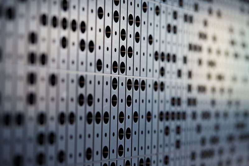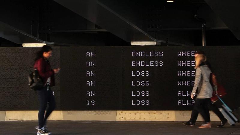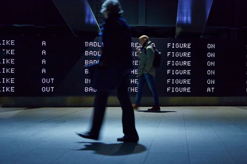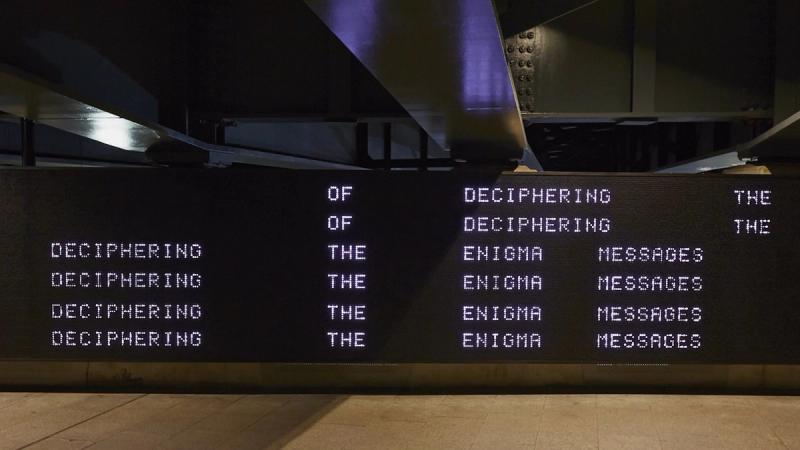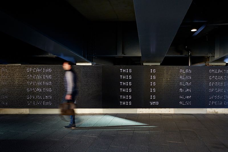 The LED and perforated aluminium panels display a hard-coded version of extracts from Turing’s ground-breaking paper ‘Computing Machinery and Intelligence’. Within the software lives a commissioned poem by Nick Drake, inspired by Turing’s work and untimely death. The artwork gives viewers a sense of witnessing a machine trying to write like a poet, whilst thinking like a machine.