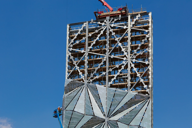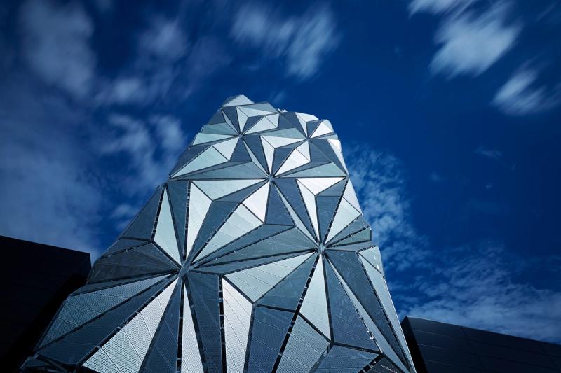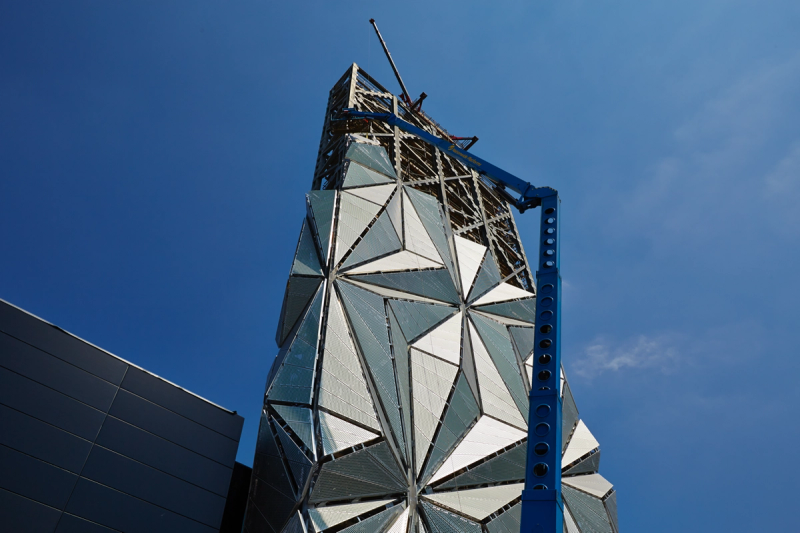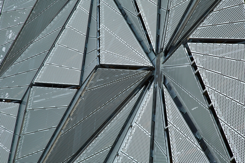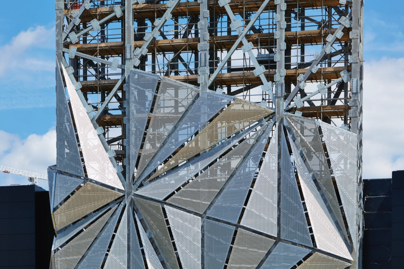 The perforated panels are made of all aluminium, fixed to a steel primary frame. The structure is made of hundreds of panels, each shaped like a triangle, that has been lifted and bolted into the primary frame, which creates the moiré’s effect of water-like movement. By layering of perforated triangles, the artwork creates an optical effect of water and a dynamic constantly changing surface. The aluminium panels are overlapped at different angels, creating a surface that appears to shimmer as you move around it.