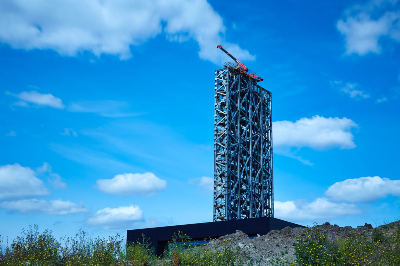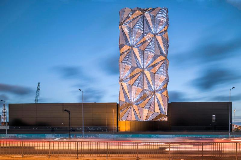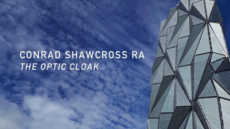 Optic Cloak, transforms the 49-metre flue (chimney) of the Low Carbon Energy Centre from a heavy, traditional frame into a lightweight sculptural structure. British artist Conrad Shawcross created a ‘moiré’ camouflage effect, inspired by dazzle camo from first world war ships and optical illusions. Moiré is a French term for a textile that has a rippled or water-like appearance.