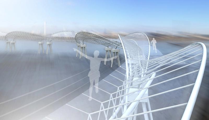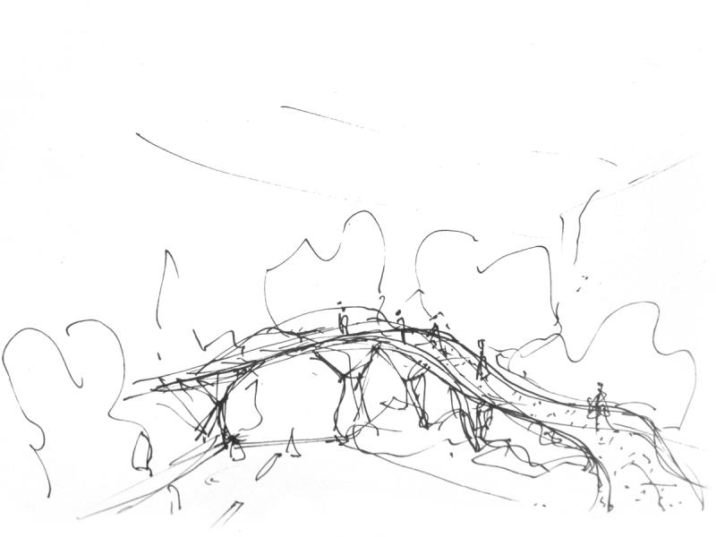 Later iterations evolved the route into a lightweight elevated walkway, connecting a series of landscaped “islands” supported by sculptural steel columns. These islands were conceived as places to pause as well as move, integrating planting, seating and small-scale amenities within the landscape below.