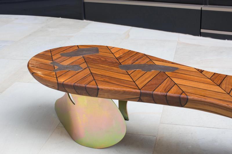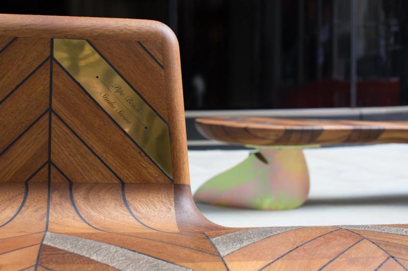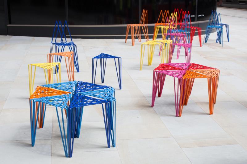 Studio Swine also created a set of occasional seating. Inspired by looms used to make fabrics for shirts and ties the Loom Chair & Stool echo the intersecting threads of the weaving process.