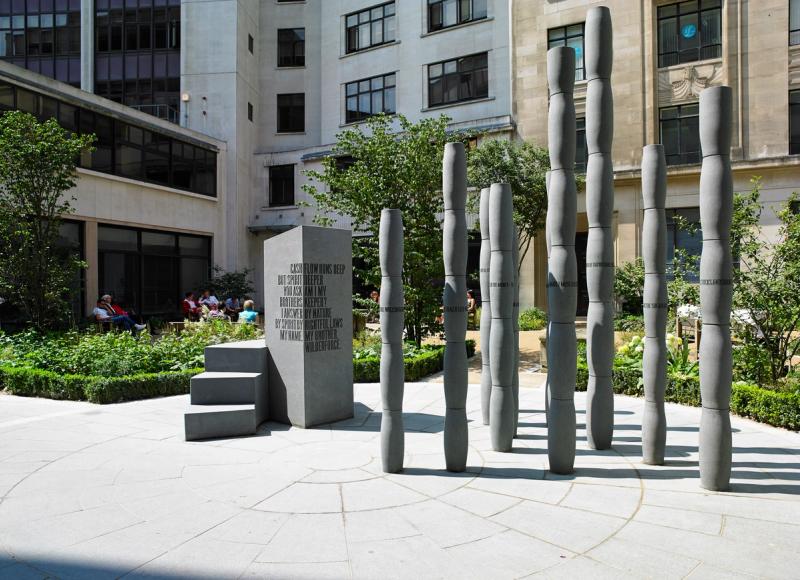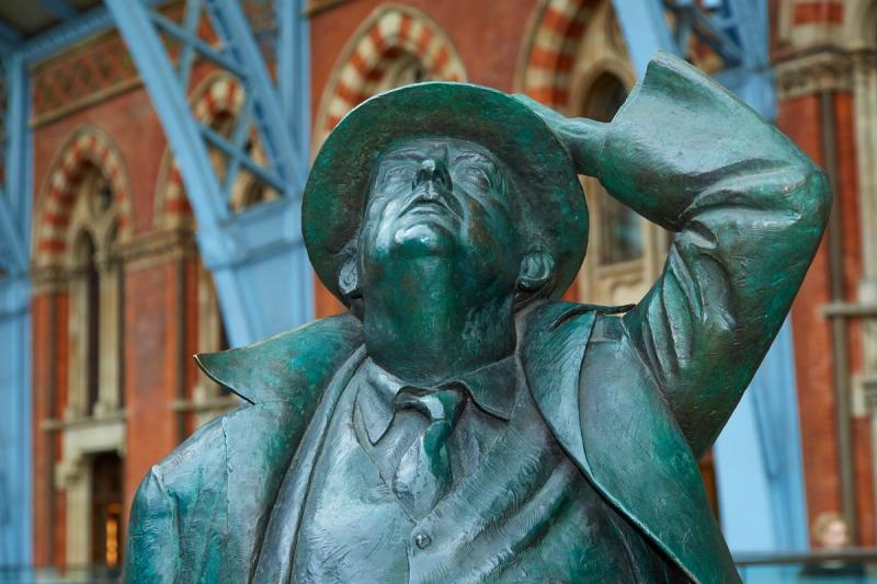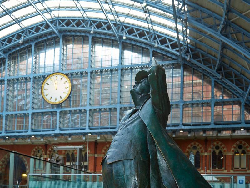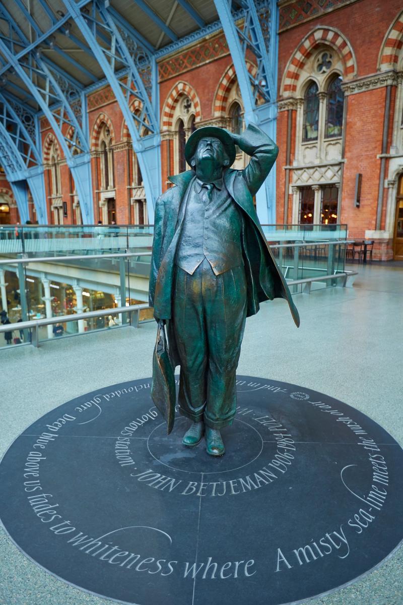 Sited on the main concourse beneath the soaring Barlow Shed roof, the larger-than-life bronze figure depicts Betjeman in motion - clad in suit, mackintosh and trilby - gazing upwards at the architecture he fought to preserve. The sculpture stands on a plinth of Cumbrian slate, engraved with lines from Betjeman’s poetry that reflect his love of place, travel and the built environment.