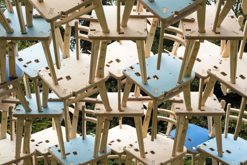 The project culminated in The Last Chair Arch, a temporary sculptural installation assembled collectively by residents, students and makers. Public works designed a bespoke ‘Chair for Arching’, CNC-cut and assembled using traditional timber joints without secondary structural elements. Over a week-long public build, 170 chairs were assembled into a free-standing arch at Wye Dene.