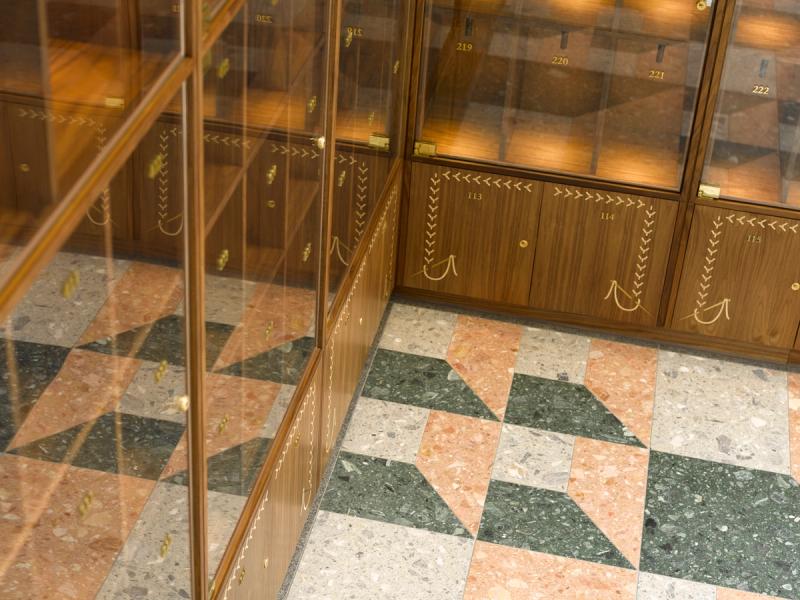 The ornate interior ceiling is covered in a wheatsheaf design that alludes to the sacks of wheat historically used as currency and link with the barter and exchange of the old St James’s Market and the floor is laid in pale red, green and brown terrazzo.