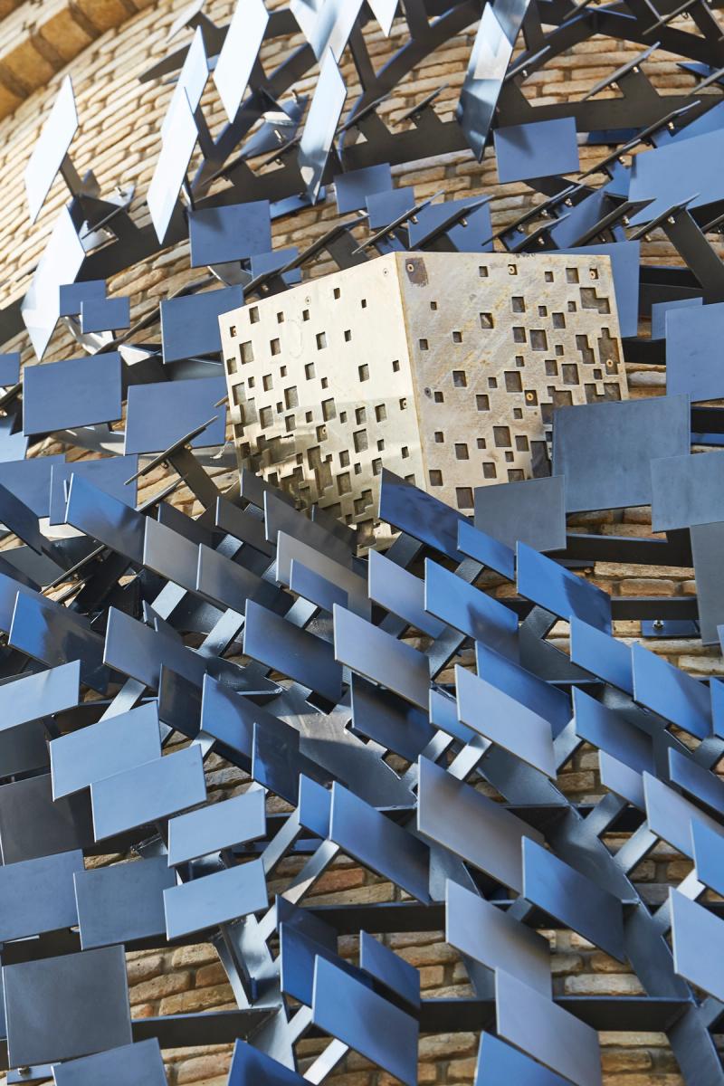 Drawing inspiration from the local area’s topography and the River Thames, Hayes Ward explored themes of water, movement, gravity and urban convergence. The result is a dynamic composition of five steel plate formations that shift in light throughout the day, anchored by a central cast aluminium bronze cube that reflects her signature design style.