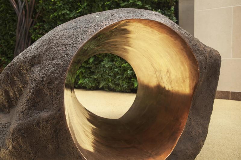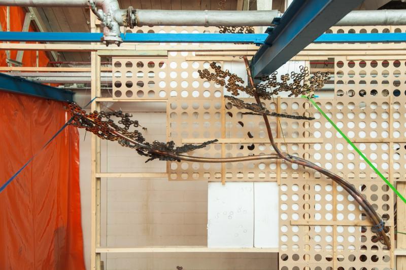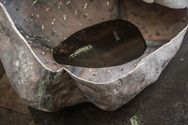 The foliage, cast in bronze from masters made from partially melted plastic pipe, is patinated black on one side and polished to a mirror finish on the other. The result is a contemplative work of art with an iridescent surface as changeable as the weather.