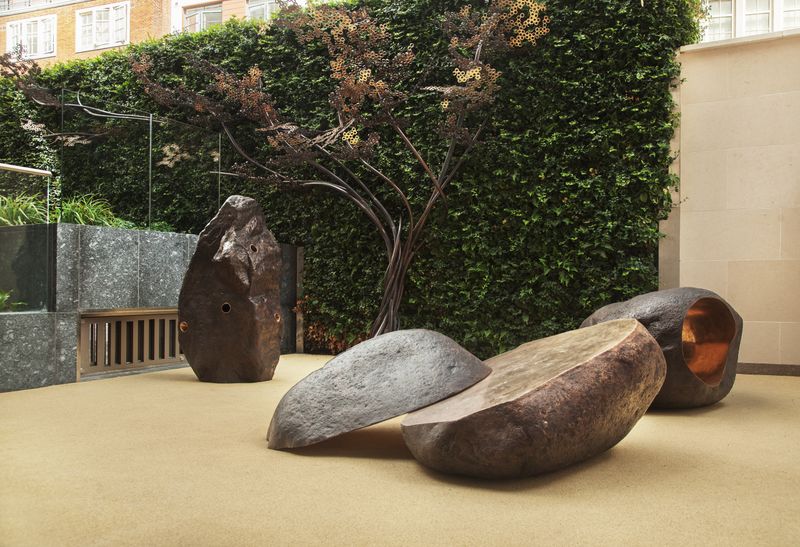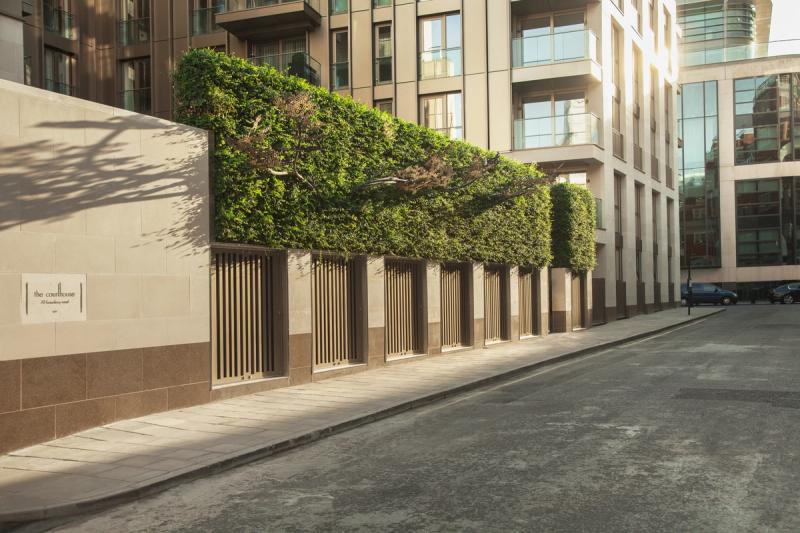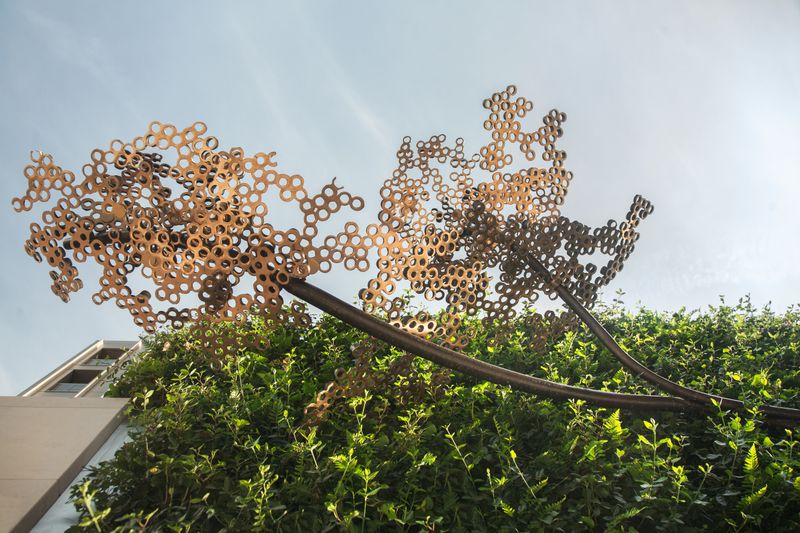 Spanning some 12 metres, the sculpture rises up and through a living green wall, its shimmering leaves overlooking a private courtyard on one side and Romney Street on the other.