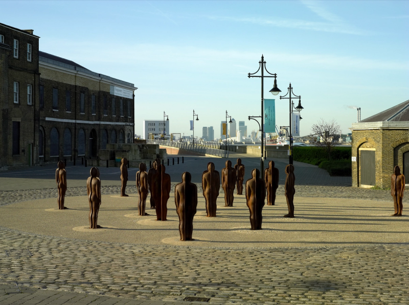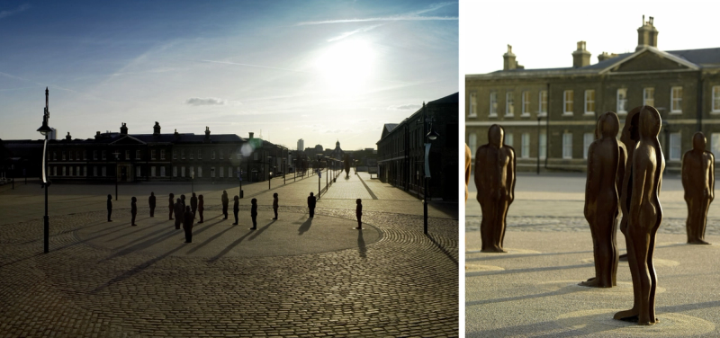 RB: This is a cluster of standing Corten steel figures, large rust patina robotic structures which reference generations of local people and communities who had worked at the Arsenal as munitions workers. I really liked the way the new residents now living in the converted factories interacted with and genuinely liked the sculptures and I wanted to show that overlap between this heroic reference to the past and its context in a new restored and repurposed Woolwich Arsenal.