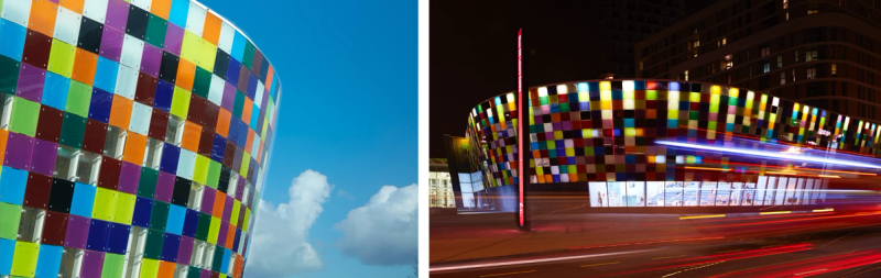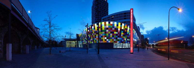 RB: This was a large streetside leisure centre in Lewisham and the new façade consisted of a vast curtain of multicoloured pixelated glass panels, animated by kinetic lighting, that changed the appearance of the building in response to external street noise, which activated lighting sensors. It required me to develop a new photographic approach, one that could suggest change, movement and interaction rather than capture a single static moment.