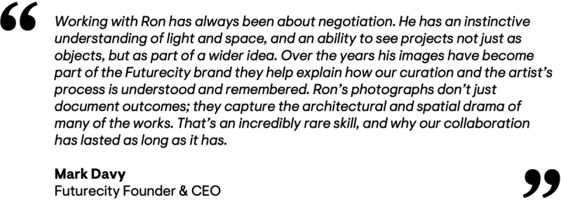 For nearly two decades internationally recognised and multi-award winning photographer Ron Bambridge has documented many of Futurecity’s public art projects, capturing not only the completed works, but also archiving the ideas, relationships and moments of exchange that shaped them. From early collaborations to major commissions, Ron Bambridge and Futurecity Founder Mark Davy worked side by side to translate these new complex art and architectural ideas into images that could communicate the work to a global audience. All photography in this article was taken by Ron Bambridge.