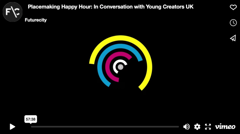 On Wednesday 26 May 2021, Futurecity hosted the second Placemaking Happy Hour webinar in conversation with Young Creators UK at their meanwhile space at 72 Upper Ground on the South Bank. The discussion focused on Young Creator’s outstanding and unique model of empowering young people across Lambeth to create professional media and digital careers and disrupt the traditional routes into the mainstream media and arts sector.