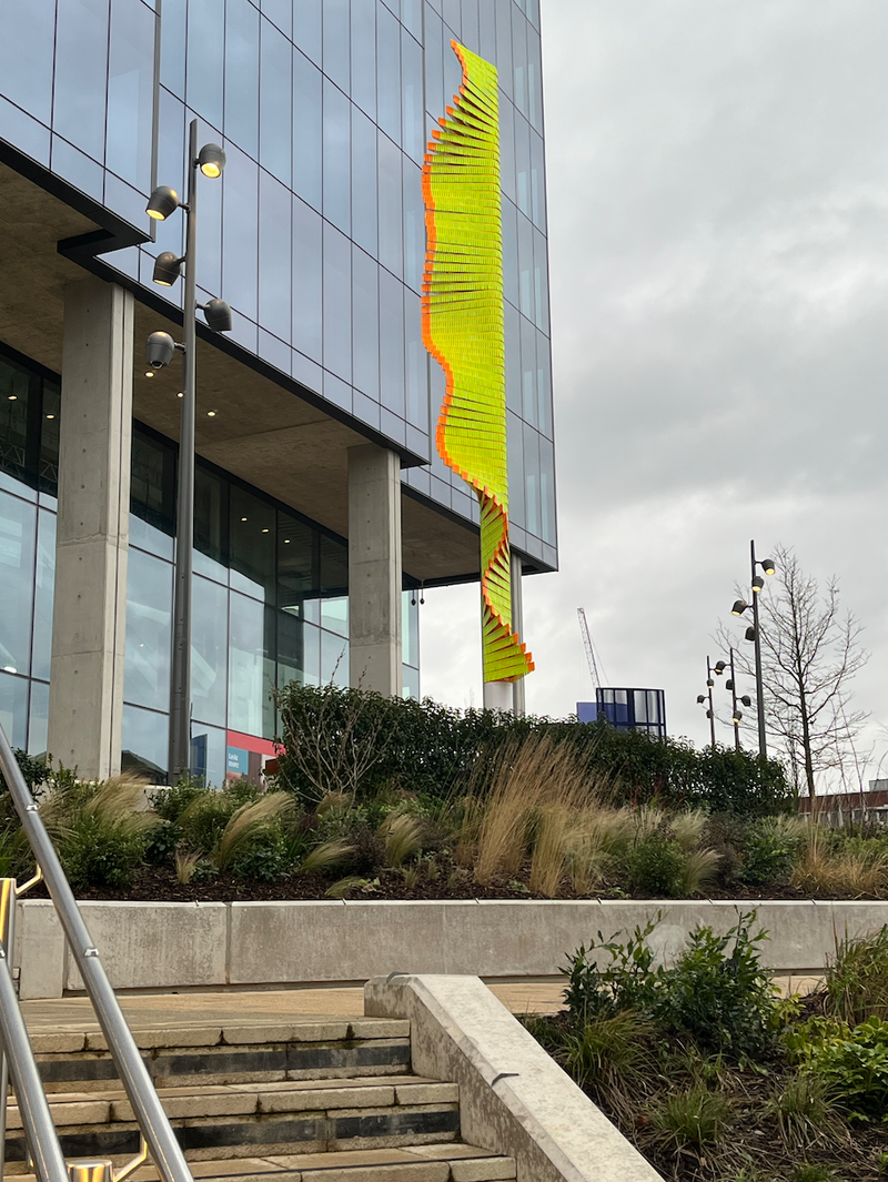 Referencing the form and symbolism of a flag, PIVOTAL draws on themes of wayfinding, celebration, and collective belonging. It was designed to evolve with its environment - responding to the weather by day and illuminating the skyline by night. Positioned in front of ONE Station Hill, it greets the 20 million passengers arriving annually through Reading Station and acts as a statement of intent for a new creative chapter in the town’s story.