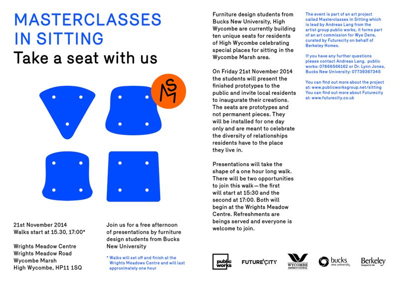 Futurecity have been appointed by Berkeley Homes to develop and manage public realm art commissions for Wye Dene, a new development in High Wycombe. The first part of these commissions is a series of community engagement projects, Masterclasses in Sitting, by art and architecture group, public works. Take a Seat With Us is the first in this series.