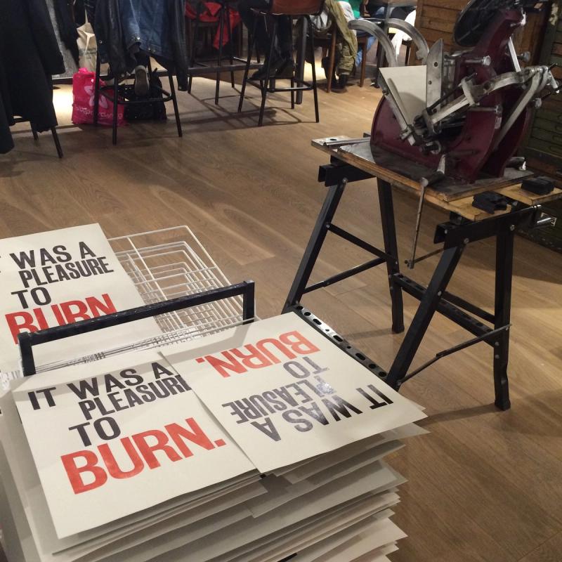 In the series of prints he is producing whilst resident in The Gallery at Foyles, Kenny will quote and re-set famous opening and closing lines from works of fiction stocked on the shelves of Foyles bookshop, using these lines as source material to produce a new body of letterpress prints that pay homage to the surrealist wordplay of ‘Exquisite Corpse’ or Cadavre exquis.