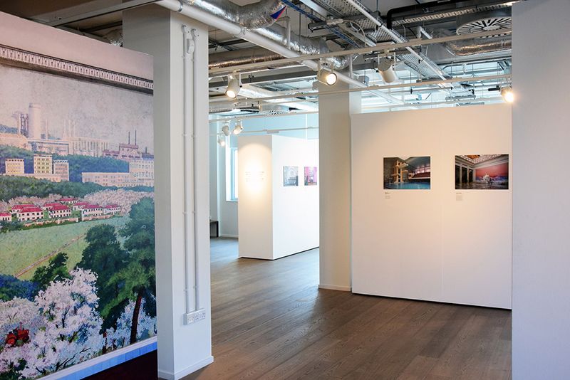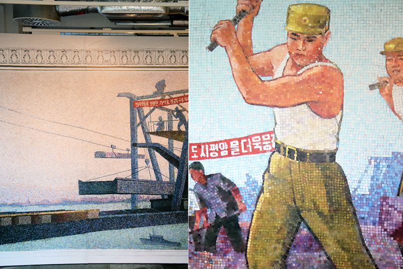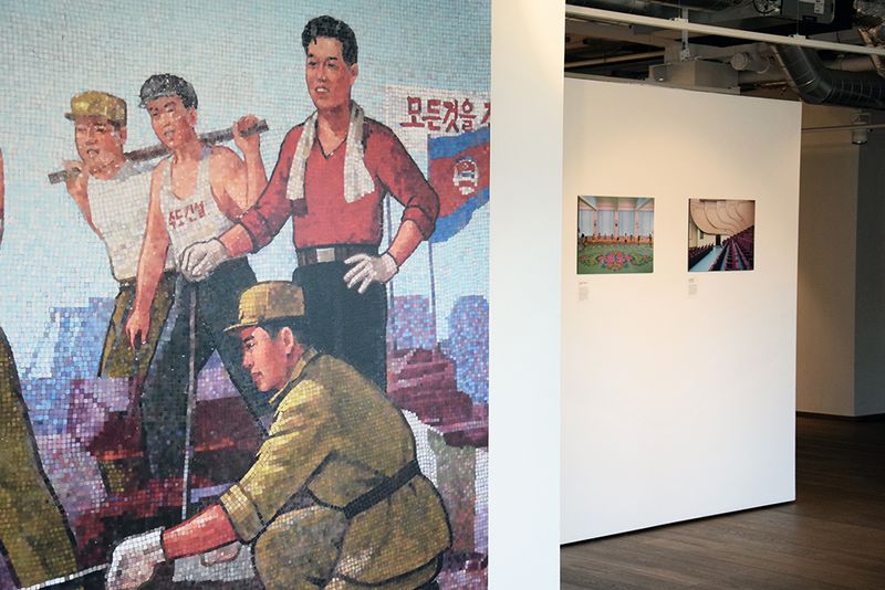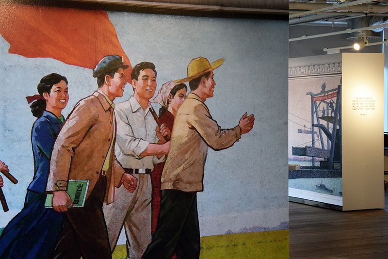 Mosaics from the Pyongyang Metro stations, reproduced as wall-sized images in the exhibition, depict heroic scenes of postwar reconstruction, alongside bounteous landscapes of agriculture and industry, showcasing the achievements of the new nation.