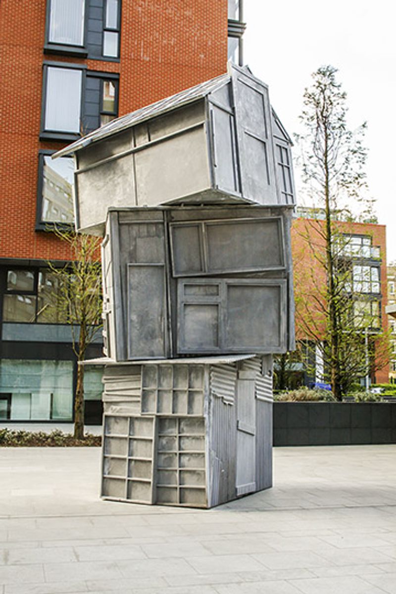 Shack Stack by Richard Wilson RA, a sculpture inspired by allotment shed structures that juxtaposes with the contemporary architecture around it.