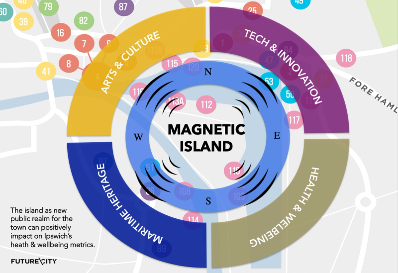 The resulting Placemaking Strategy positions the island as a new public realm for the town, positively impacting on Ipswich’s health and wellbeing. With the wider strategic connectivity work of the bridge crossings, it is the site to redefine Ipswich as a 21st century creative capital that is accessible to all, creating employment, innovation, recreation, education and homes from future generations. Thus, Futurecity proposed a new vision for Ipswich as East Anglia’s Creative Capital. It is a vision of a scale that presents Ipswich as a ‘city’ in terms of its cultural offer: a place to create and build ideas, projects, and lives.